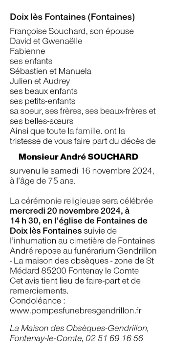 Décédé à Fontaines (85200, France) le samedi 16 novembre 2024 à l'âge de 75 ans
