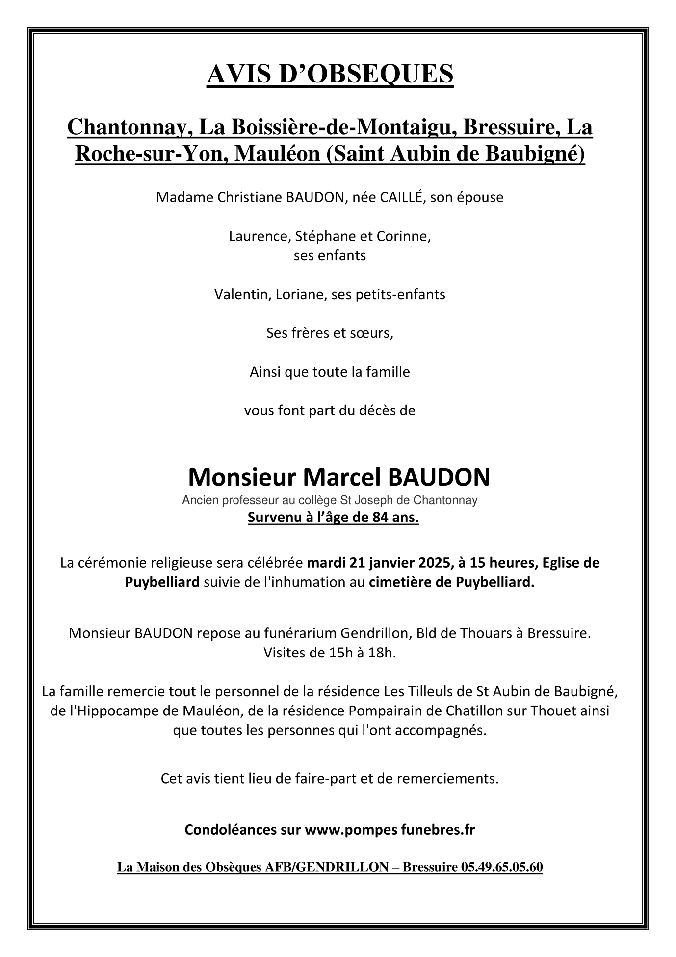 Décédé à Châtillon-sur-Thouet (79200, France) le samedi 18 janvier 2025 à l'âge de 84 ans