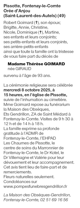 Décédée à Pissotte (85200, France) le vendredi 3 octobre 2025 à l'âge de 93 ans