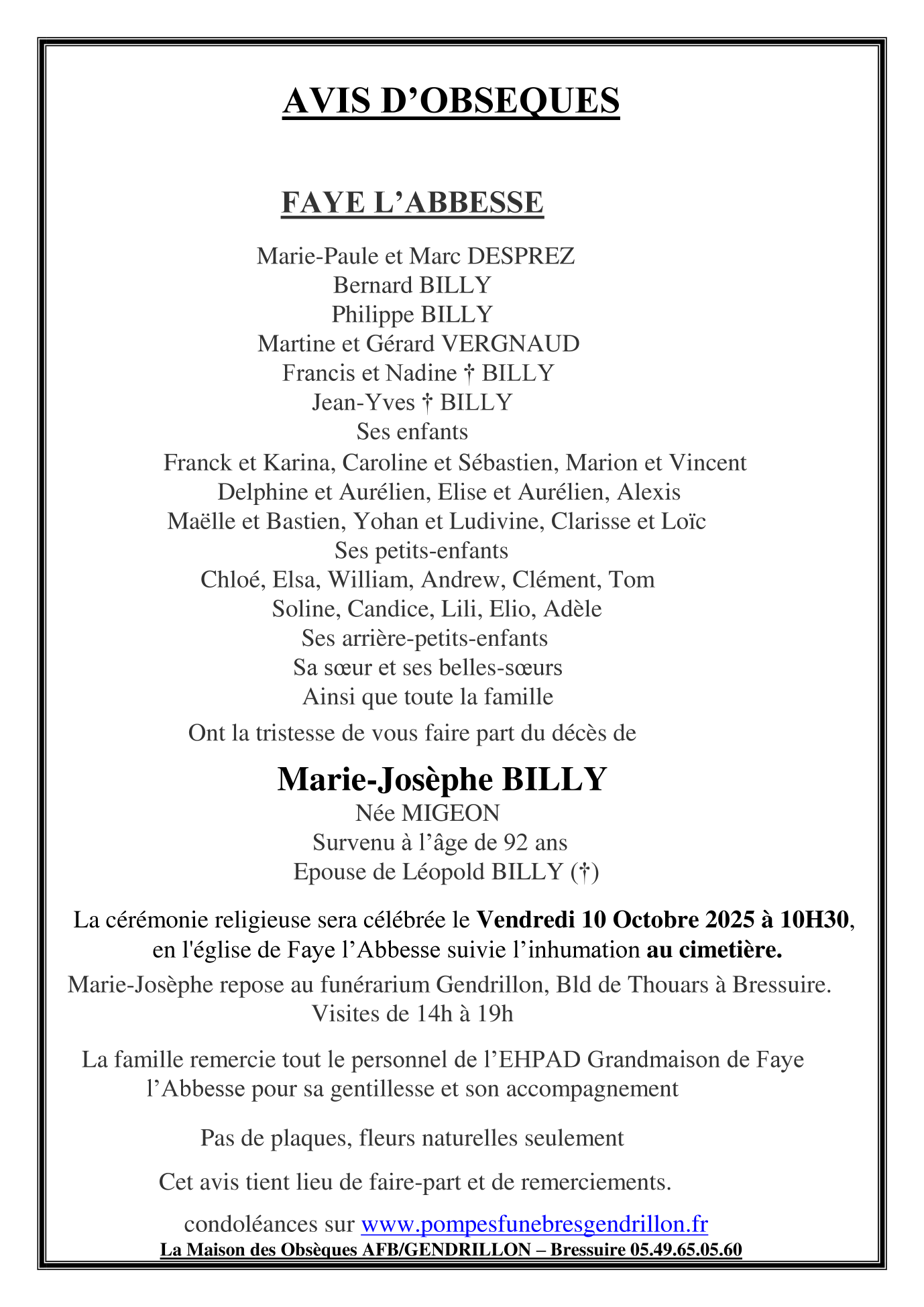 Décédée à Faye-l'Abbesse (79350, France) le lundi 6 octobre 2025 à l'âge de 92 ans