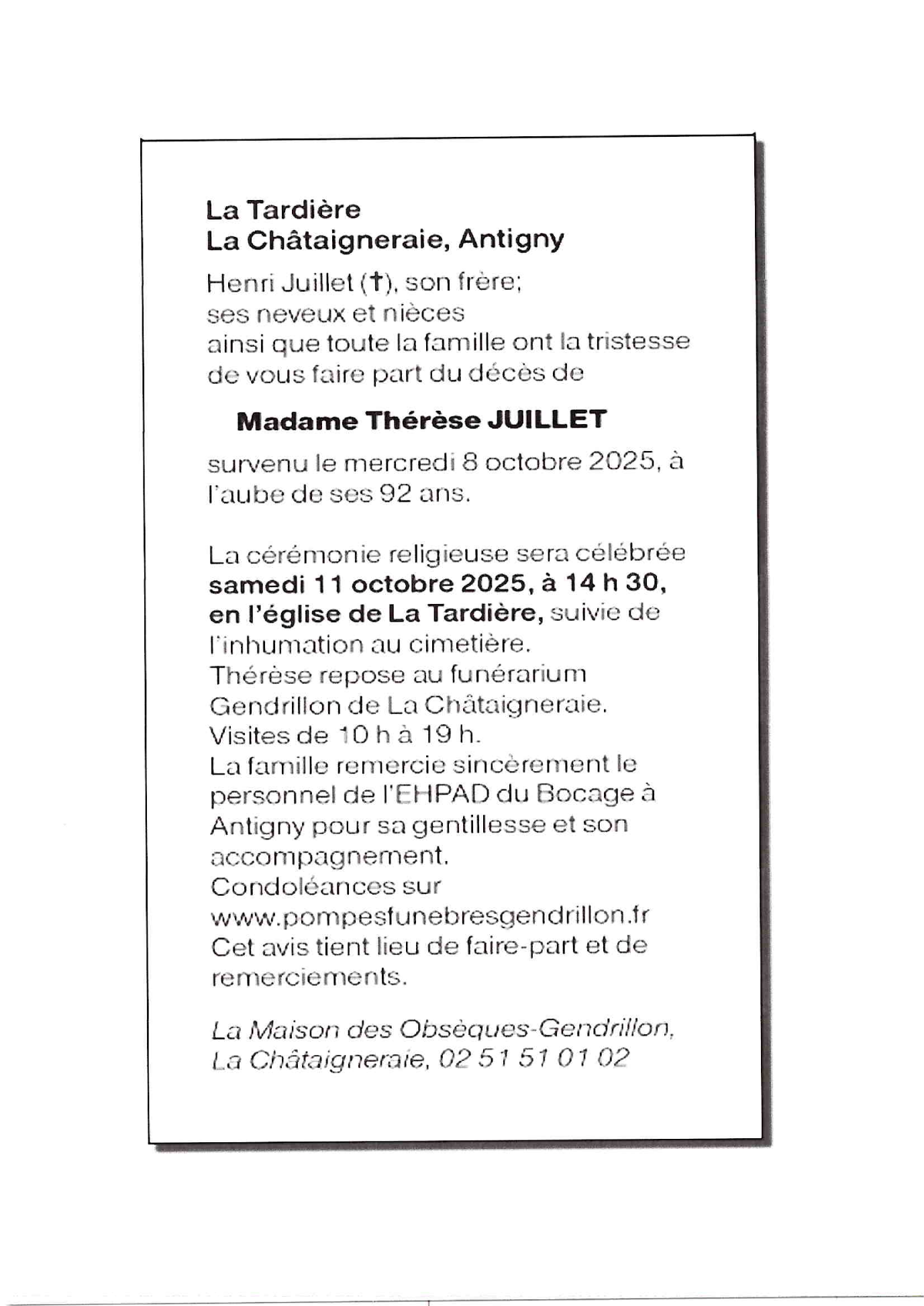 Décédée à Antigny (85120, France) le mercredi 8 octobre 2025 à l'âge de 91 ans