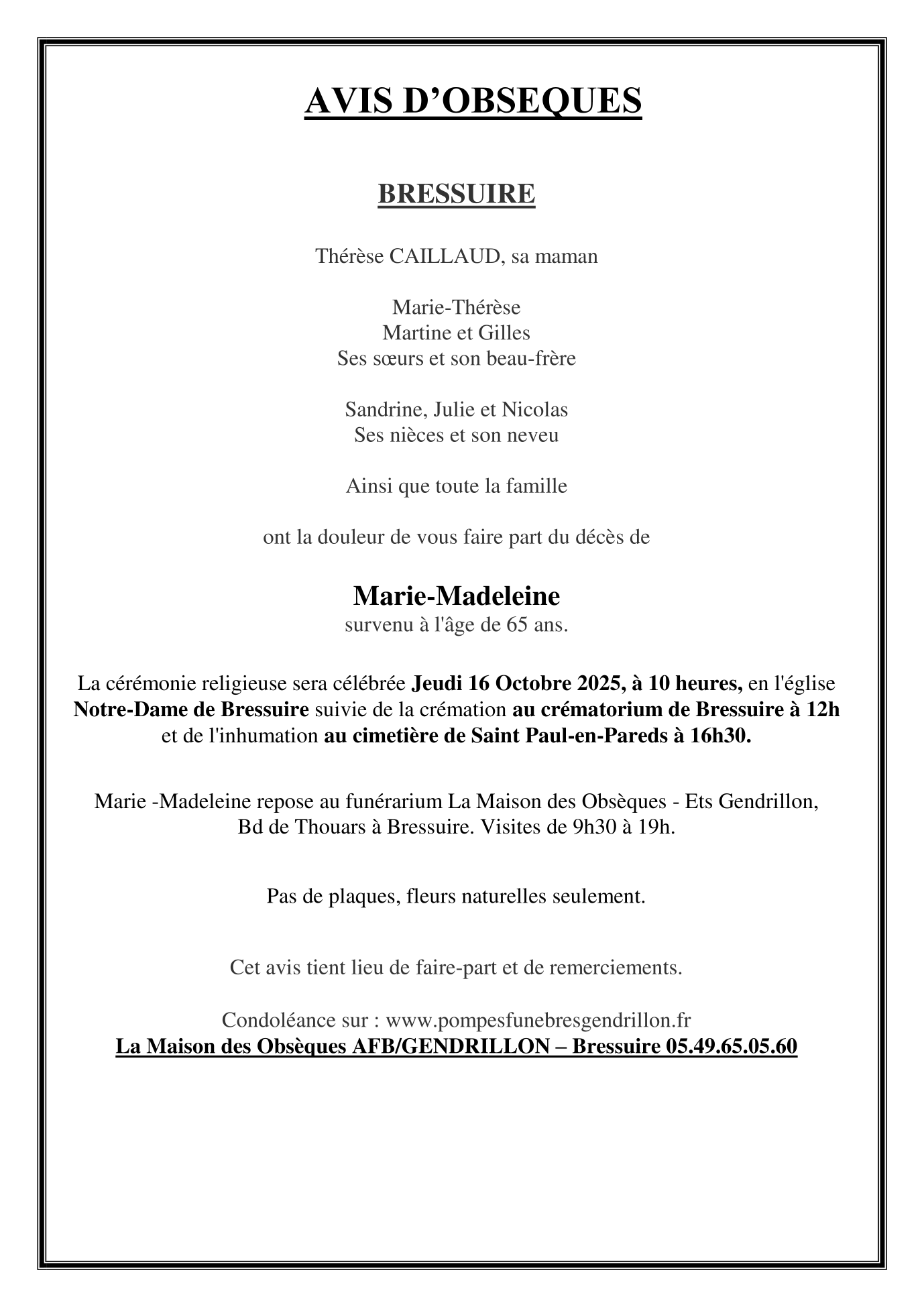 Décédée à Niort (79000, France) le mardi 14 octobre 2025 à l'âge de 65 ans