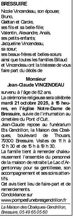 Décédé à Argentonnay (79150, France) le vendredi 17 octobre 2025 à l'âge de 82 ans