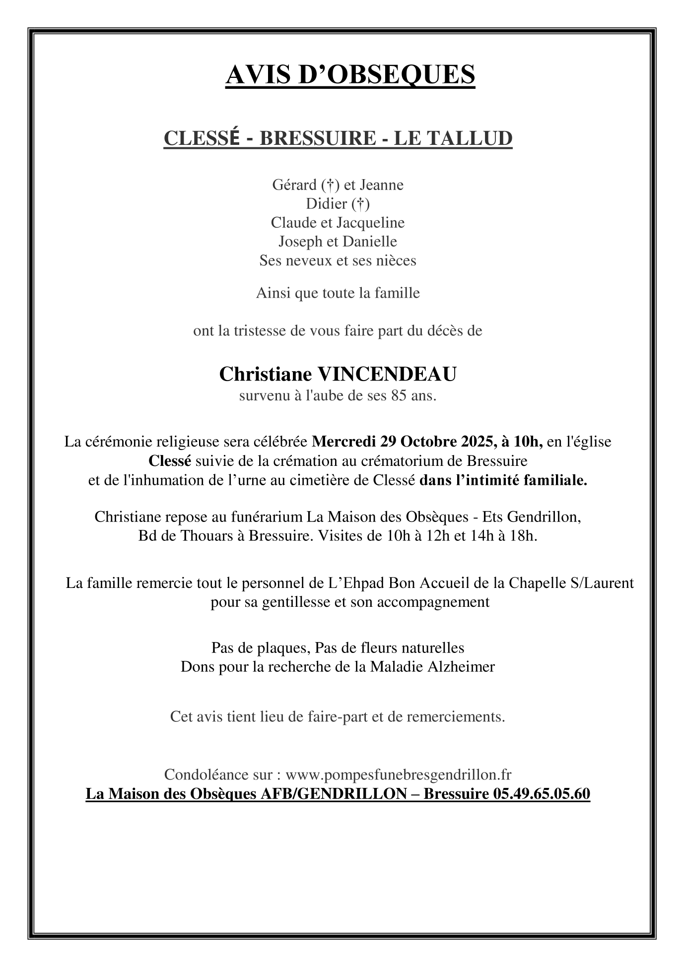 Décédée à La Chapelle-Saint-Laurent (79430, France) le jeudi 23 octobre 2025 à l'âge de 84 ans