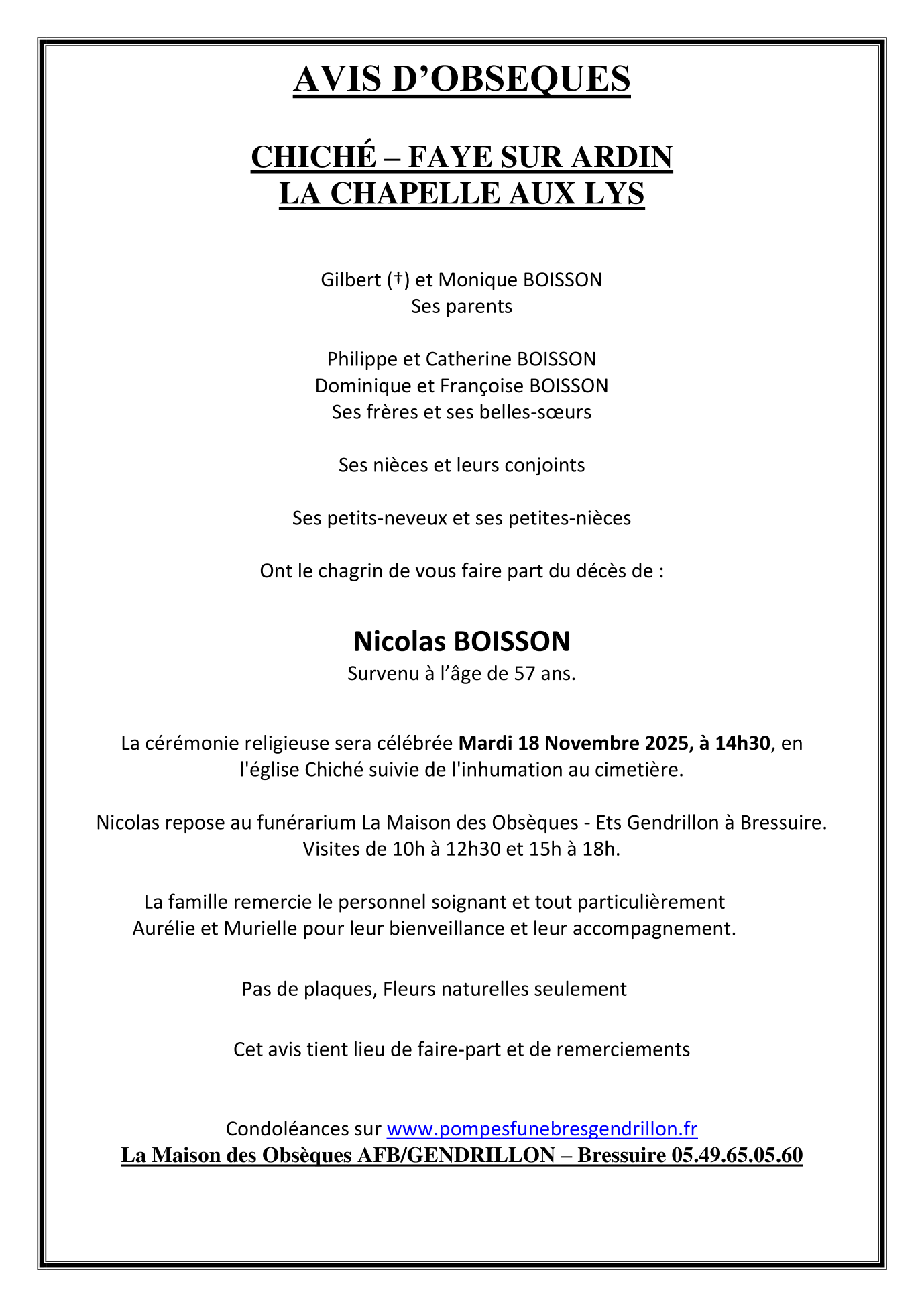 Décédé à Faye-l'Abbesse (79350, France) le samedi 15 novembre 2025 à l'âge de 57 ans