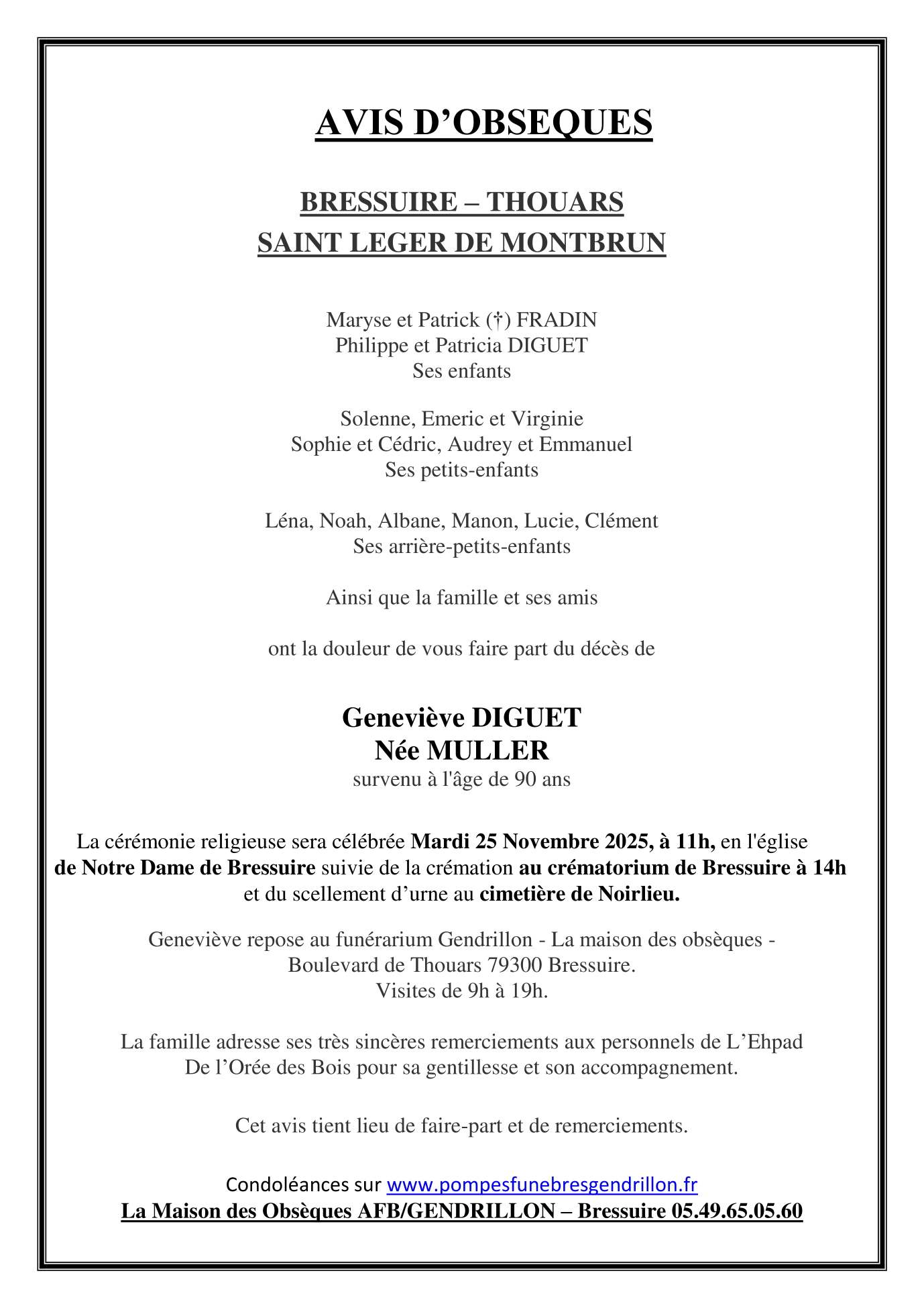 Décédée à Plaine-et-Vallées (79100, France) le mercredi 19 novembre 2025 à l'âge de 90 ans