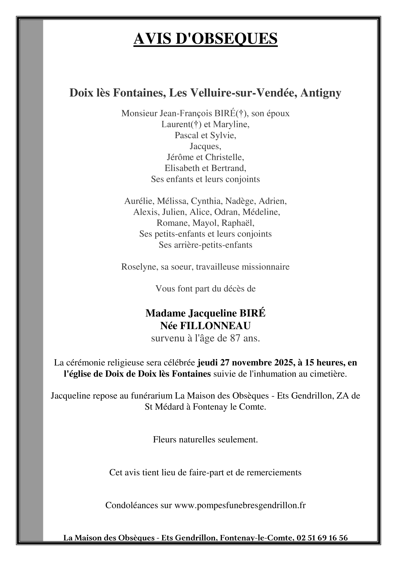 Décédée à Doix lès Fontaines (85200, France) le dimanche 23 novembre 2025 à l'âge de 87 ans
