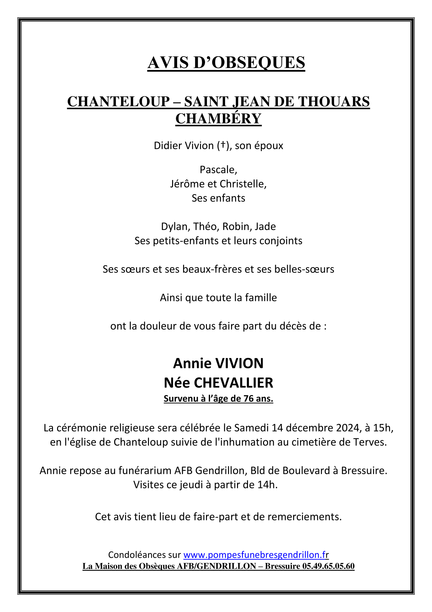 Décédée à Chambéry (73000, France) le mardi 10 décembre 2024 à l'âge de 76 ans