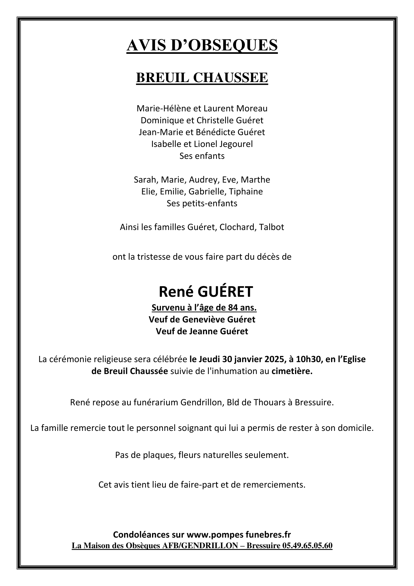 Décédé à Bressuire (79300, France) le lundi 27 janvier 2025 à l'âge de 84 ans
