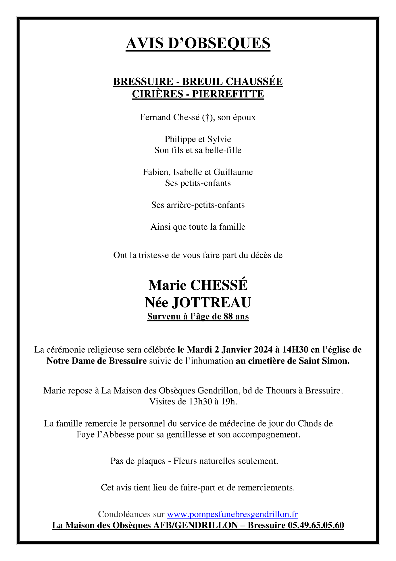 Décédée à Faye-l'Abbesse (79350, France) le vendredi 29 décembre 2023 à l'âge de 88 ans
