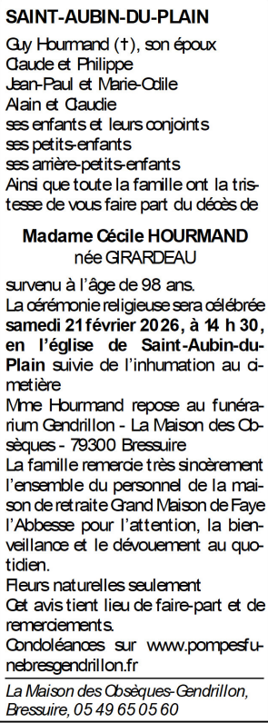 Décédée à Faye-l'Abbesse (79350, France) le mercredi 18 février 2026 à l'âge de 98 ans