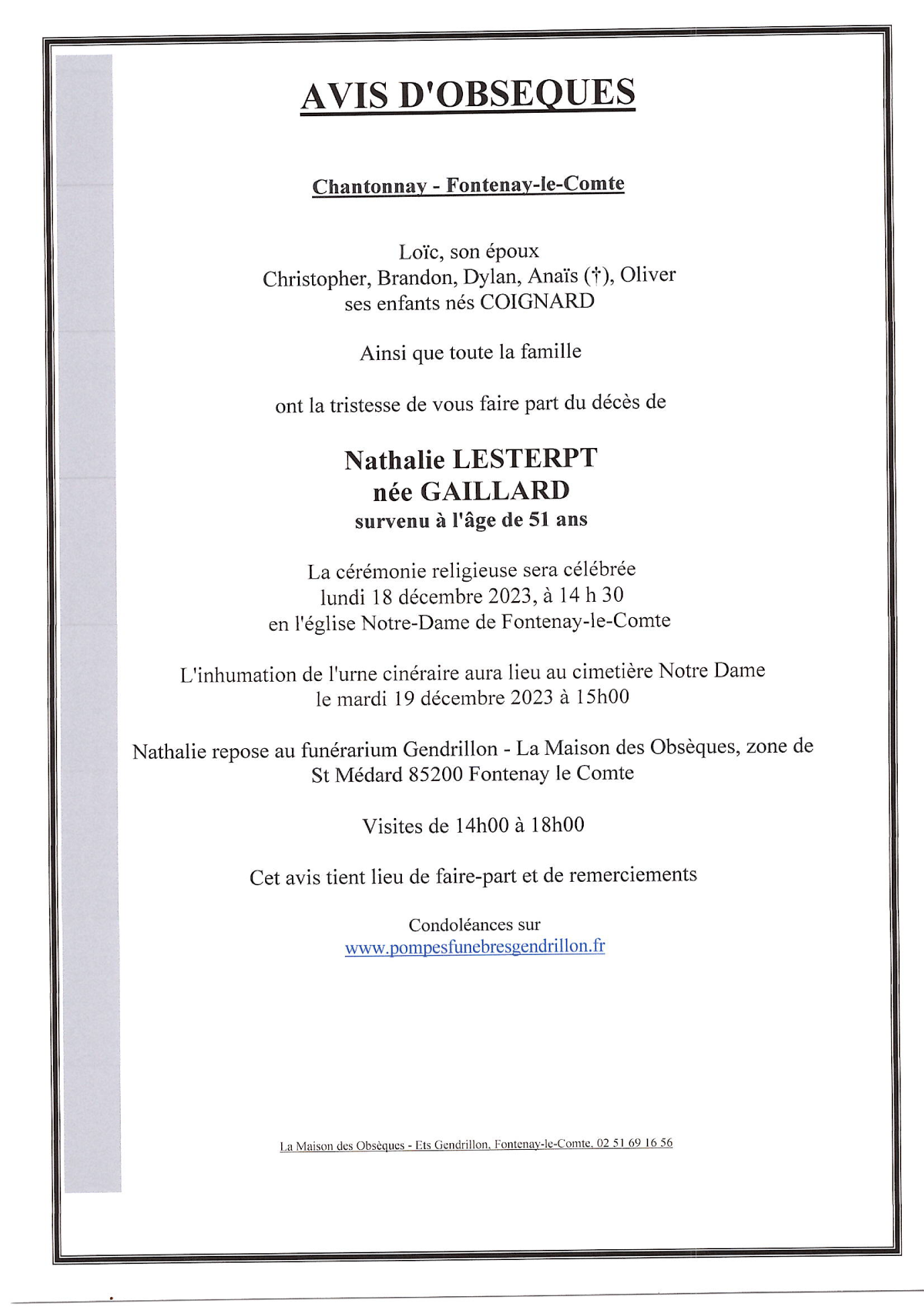 Décédée à Chantonnay (85110, France) le mercredi 13 décembre 2023 à l'âge de 51 ans