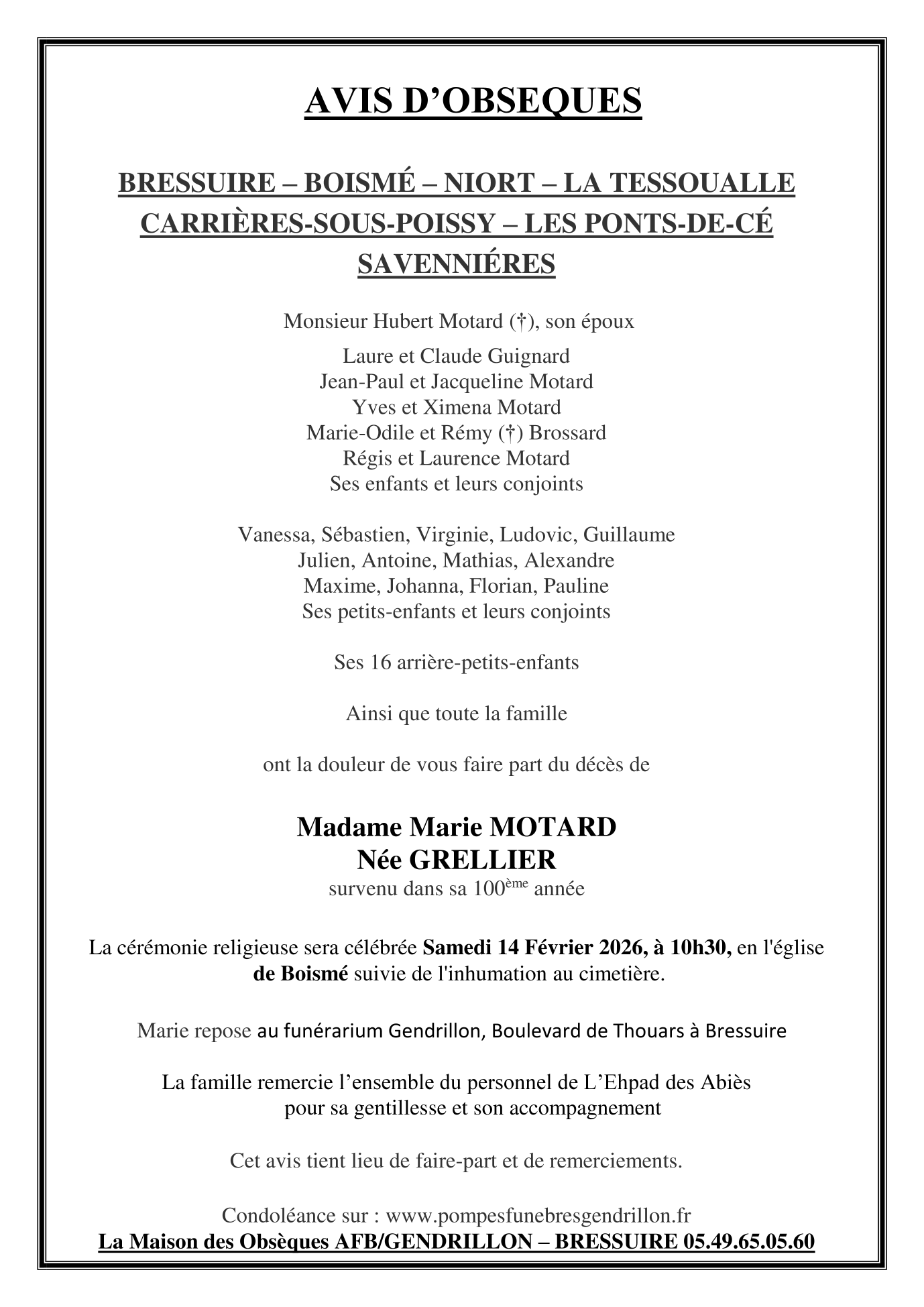 Décédée à L'Absie (79240, France) le mercredi 11 février 2026 à l'âge de 99 ans