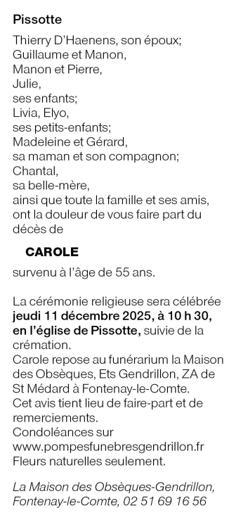Décédée à Sérigné (85200, France) le jeudi 4 décembre 2025 à l'âge de 55 ans