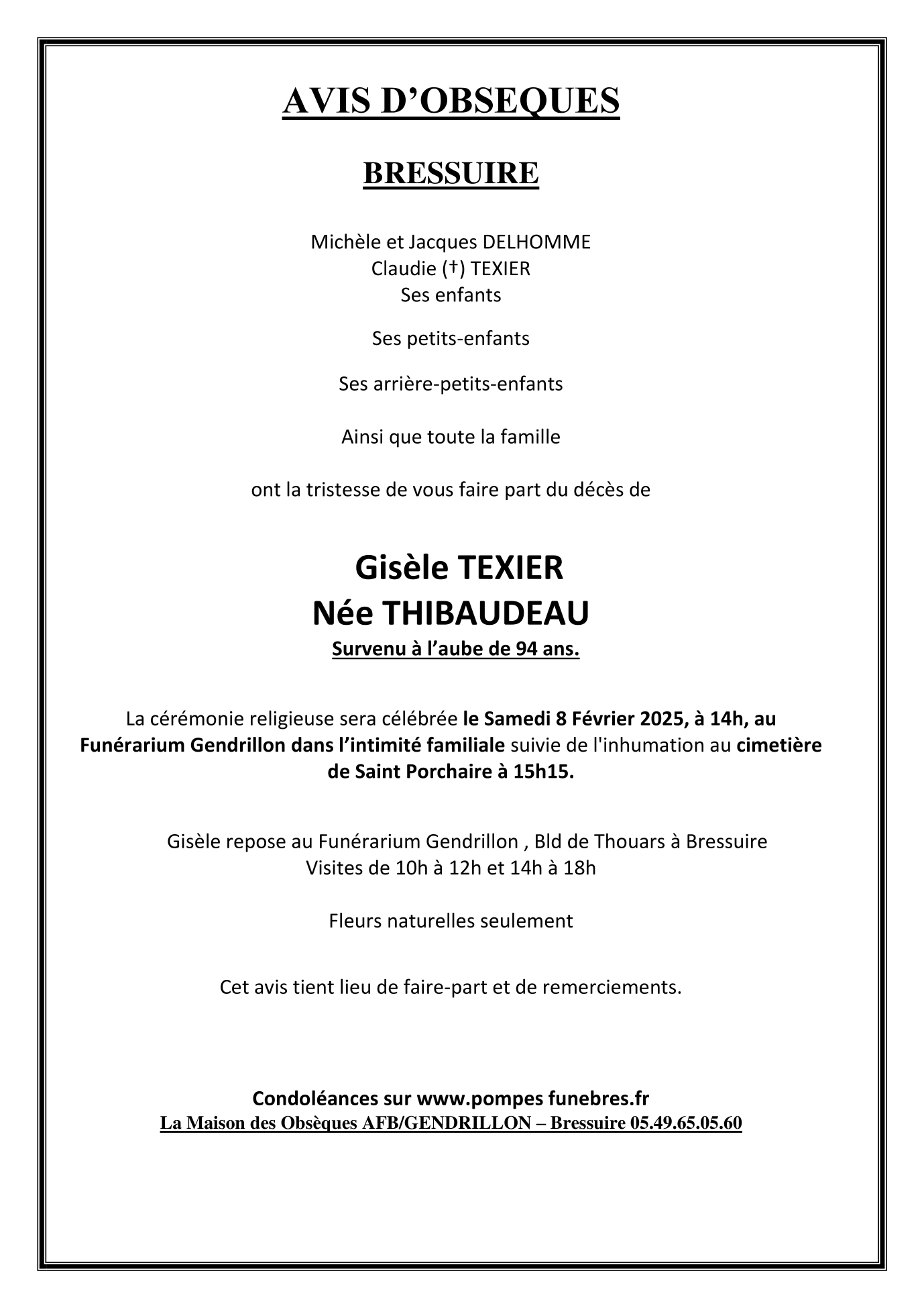 Décédée à Faye-l'Abbesse (79350, France) le mercredi 5 février 2025 à l'âge de 93 ans