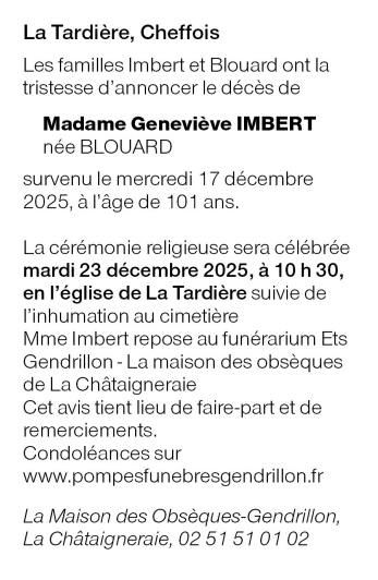 Décédée à Saint-Pierre-du-Chemin (85120, France) le mercredi 17 décembre 2025 à l'âge de 101 ans