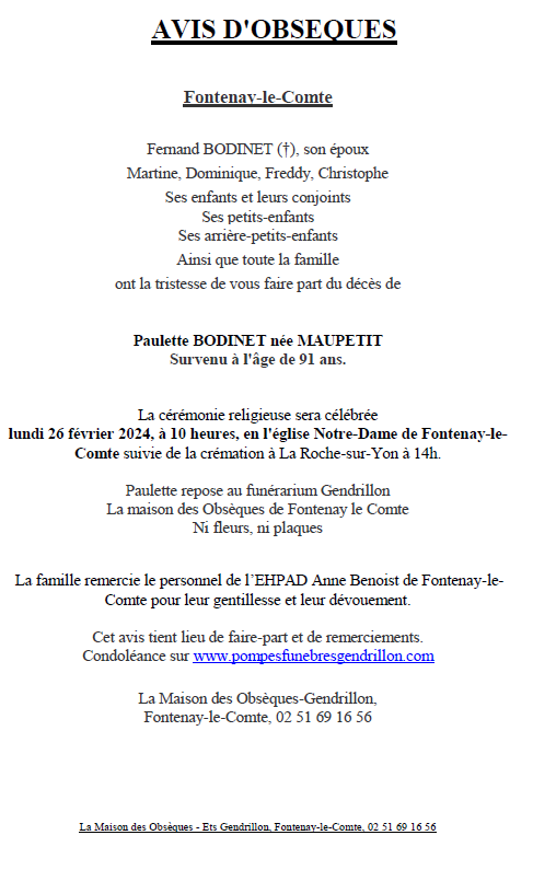 Décédée à Fontenay-le-Comte (85200, France) le mardi 20 février 2024 à l'âge de 91 ans