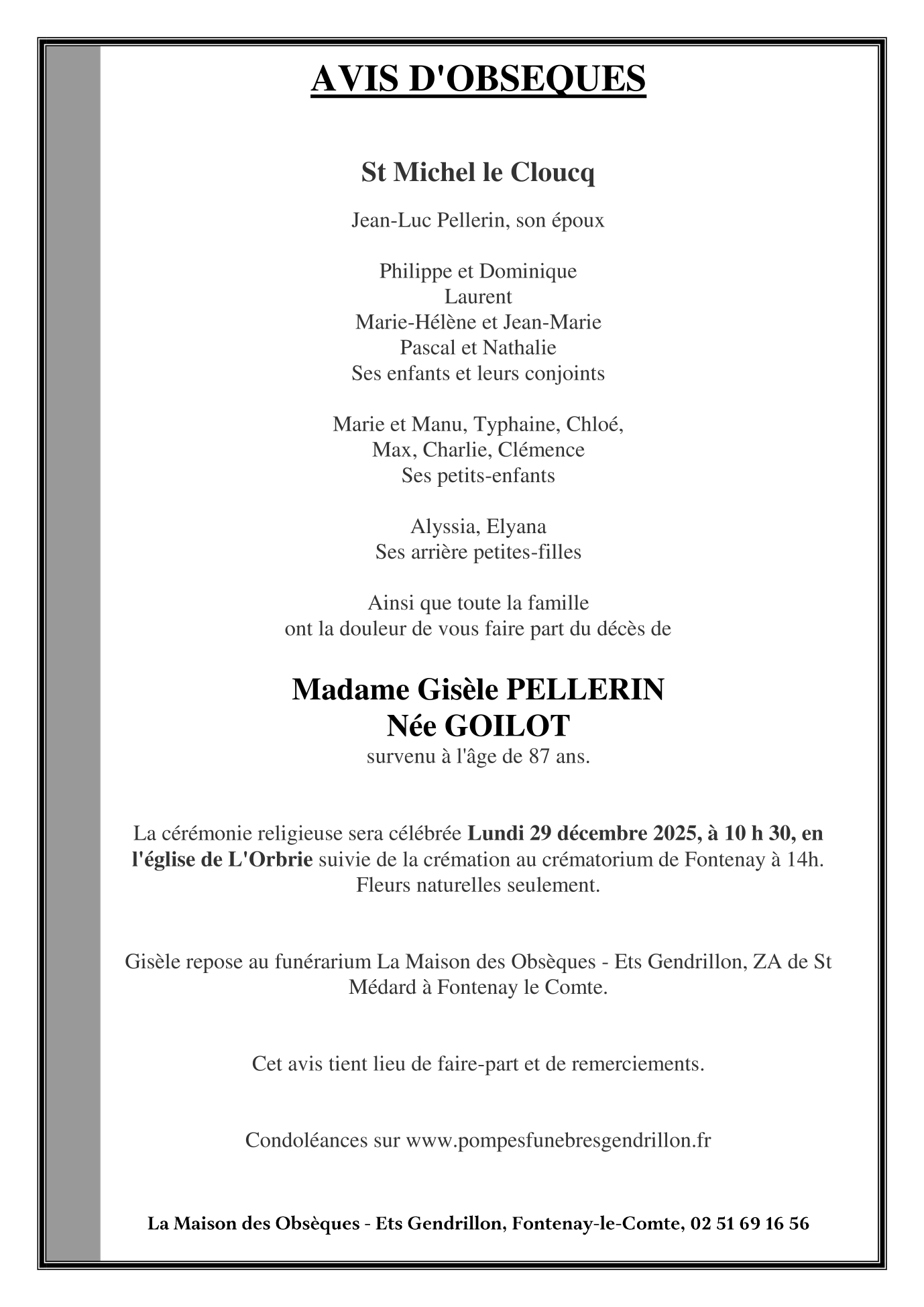 Décédée à Fontenay-le-Comte (85200, France) le mardi 23 décembre 2025 à l'âge de 87 ans