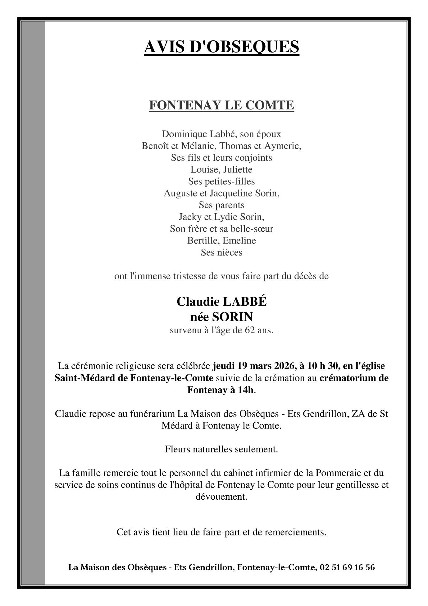 Décédée à Fontenay-le-Comte (85200, France) le dimanche 15 mars 2026 à l'âge de 62 ans