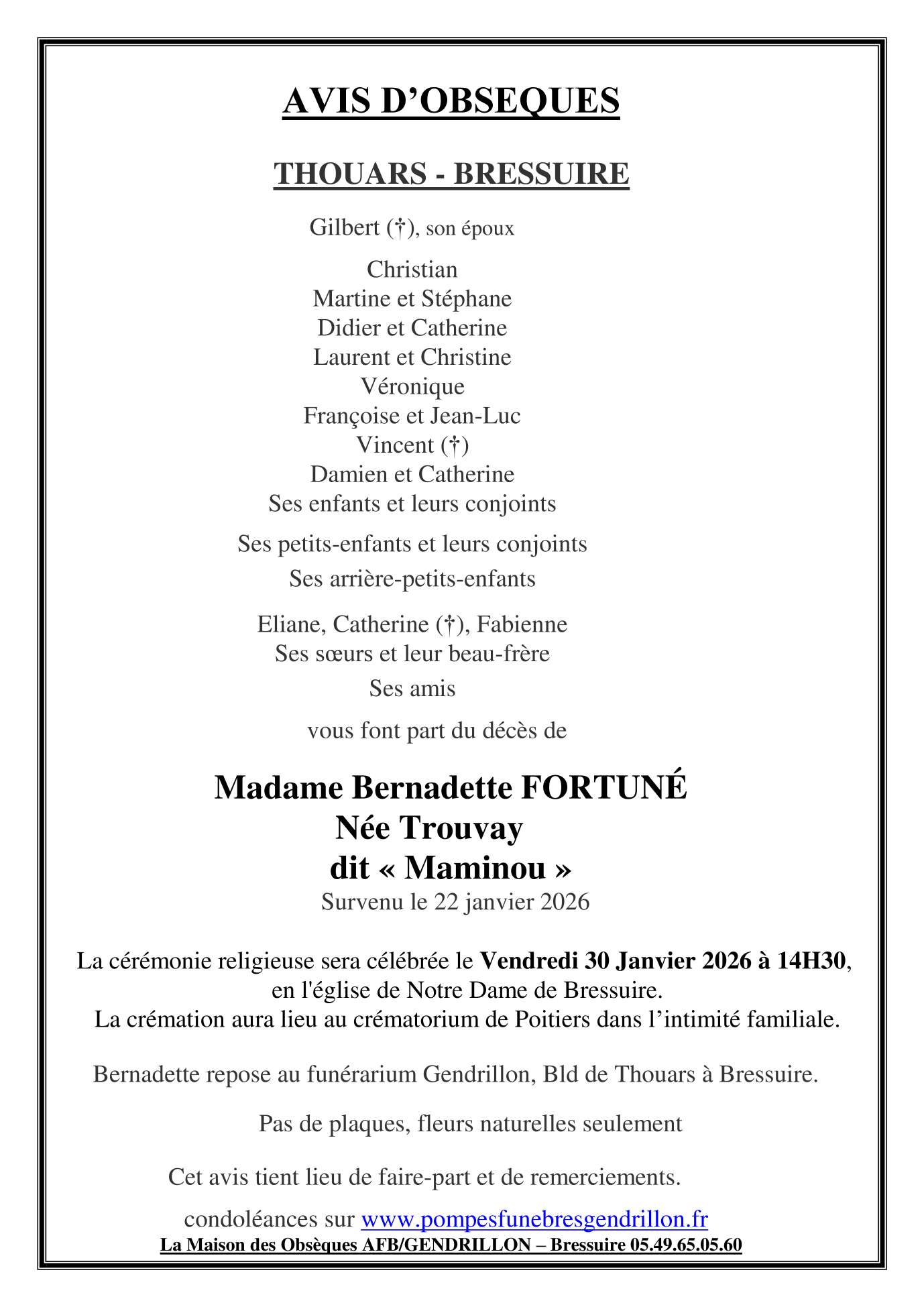 Veuve de Monsieur Gilbert FORTUNÉ