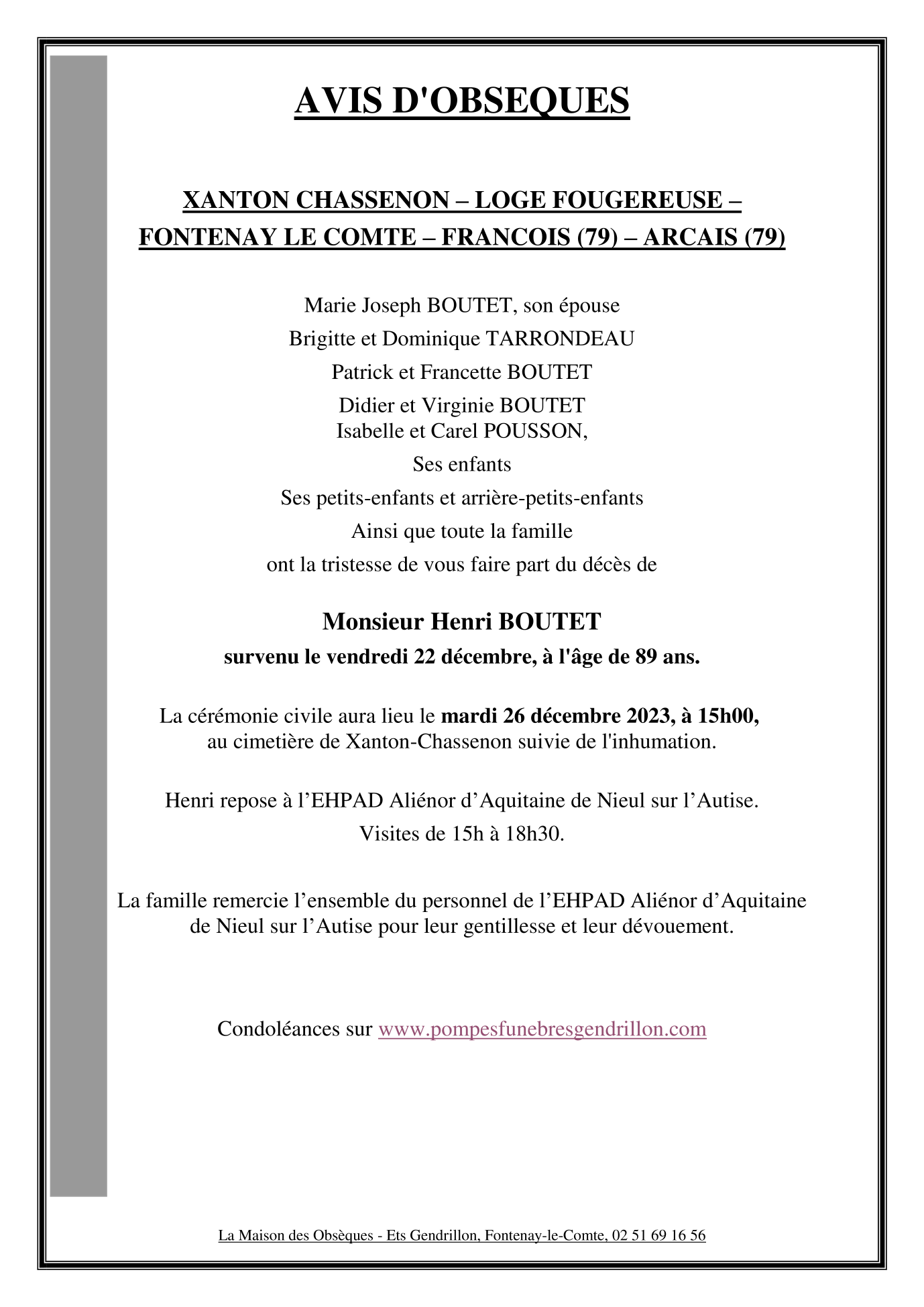 Décédé à Nieul sur l'Autise (85240, France) le vendredi 22 décembre 2023 à l'âge de 89 ans