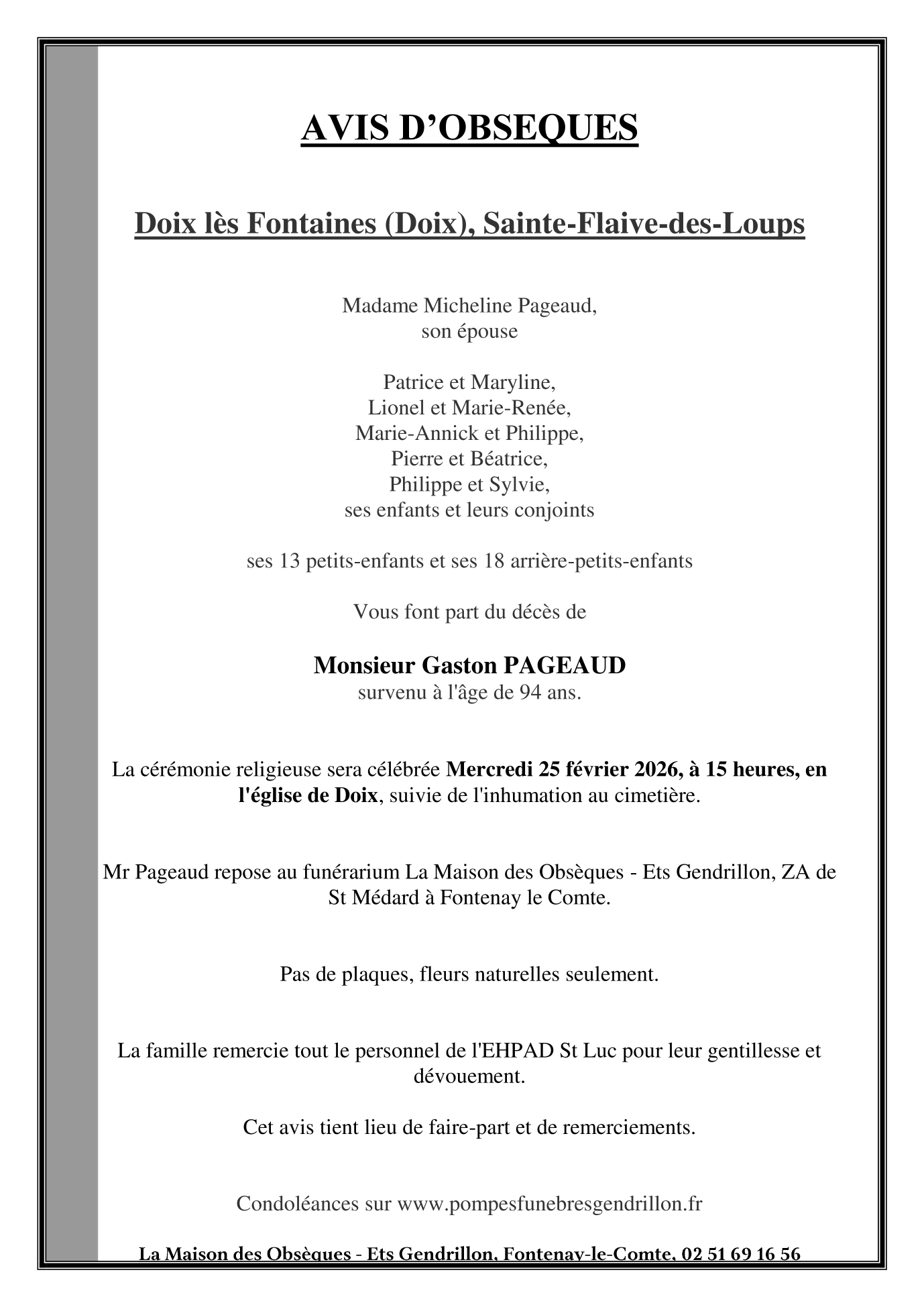 Décédé à Doix lès Fontaines (85200, France) le dimanche 22 février 2026 à l'âge de 94 ans