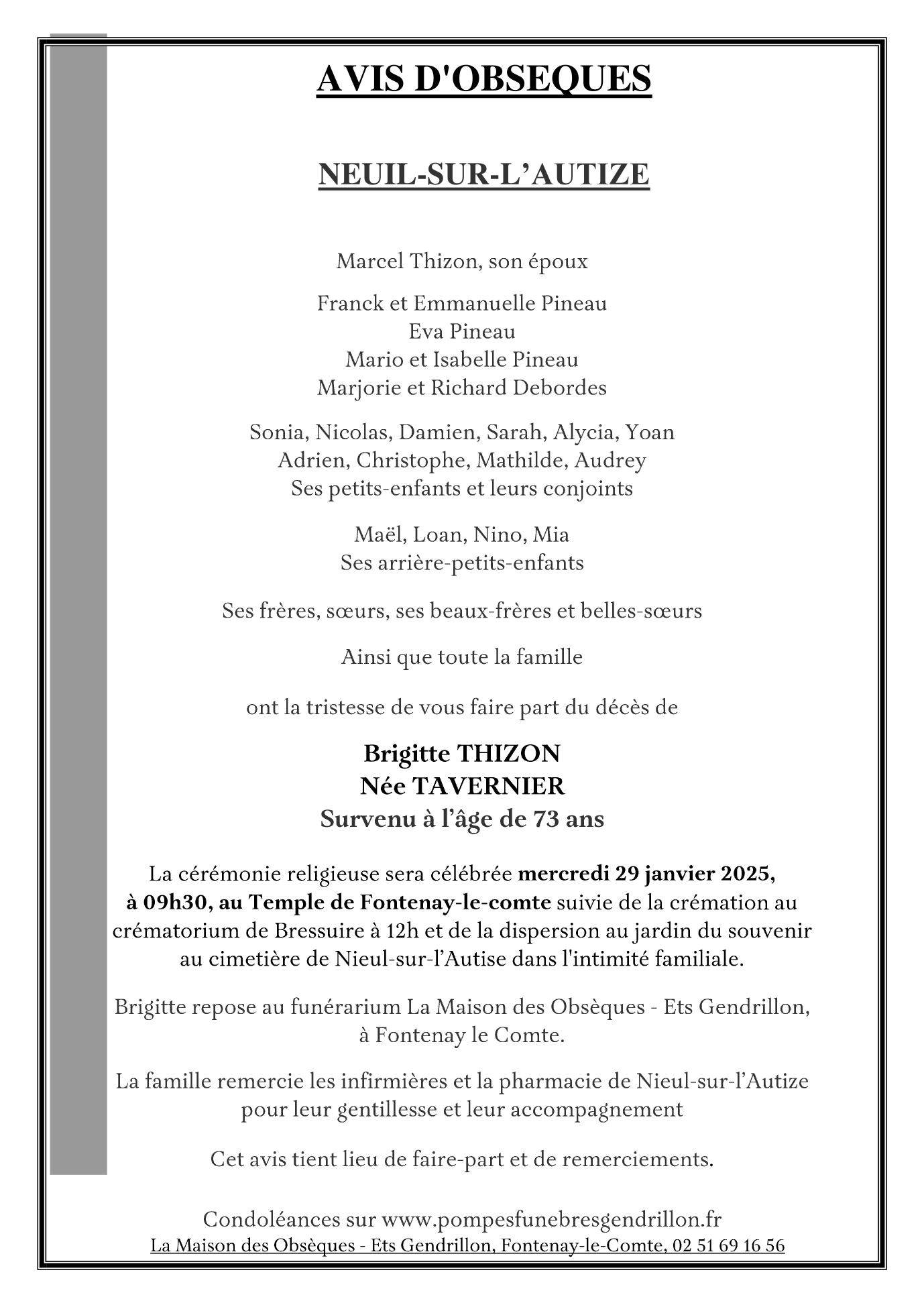 Décédée à La Châtaigneraie (85120, France) le samedi 25 janvier 2025 à l'âge de 73 ans