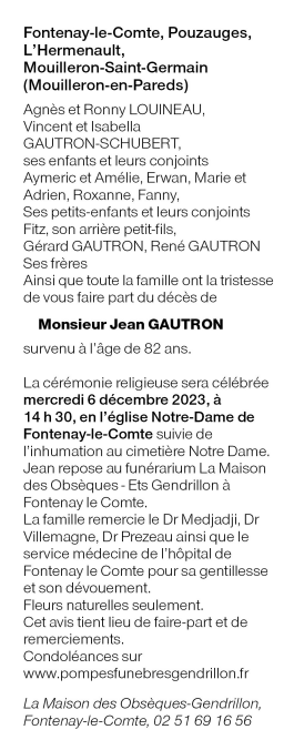 Décédé à Fontenay-le-Comte (85200, France) le samedi 2 décembre 2023 à l'âge de 82 ans