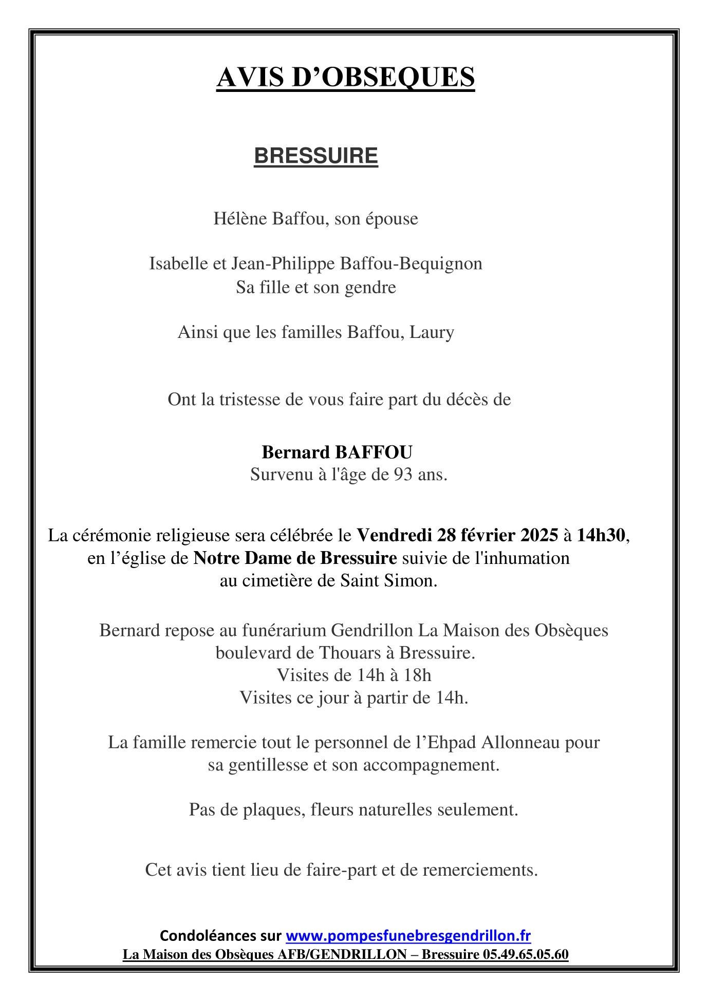 Décédé à Faye-l'Abbesse (79350, France) le lundi 24 février 2025 à l'âge de 93 ans