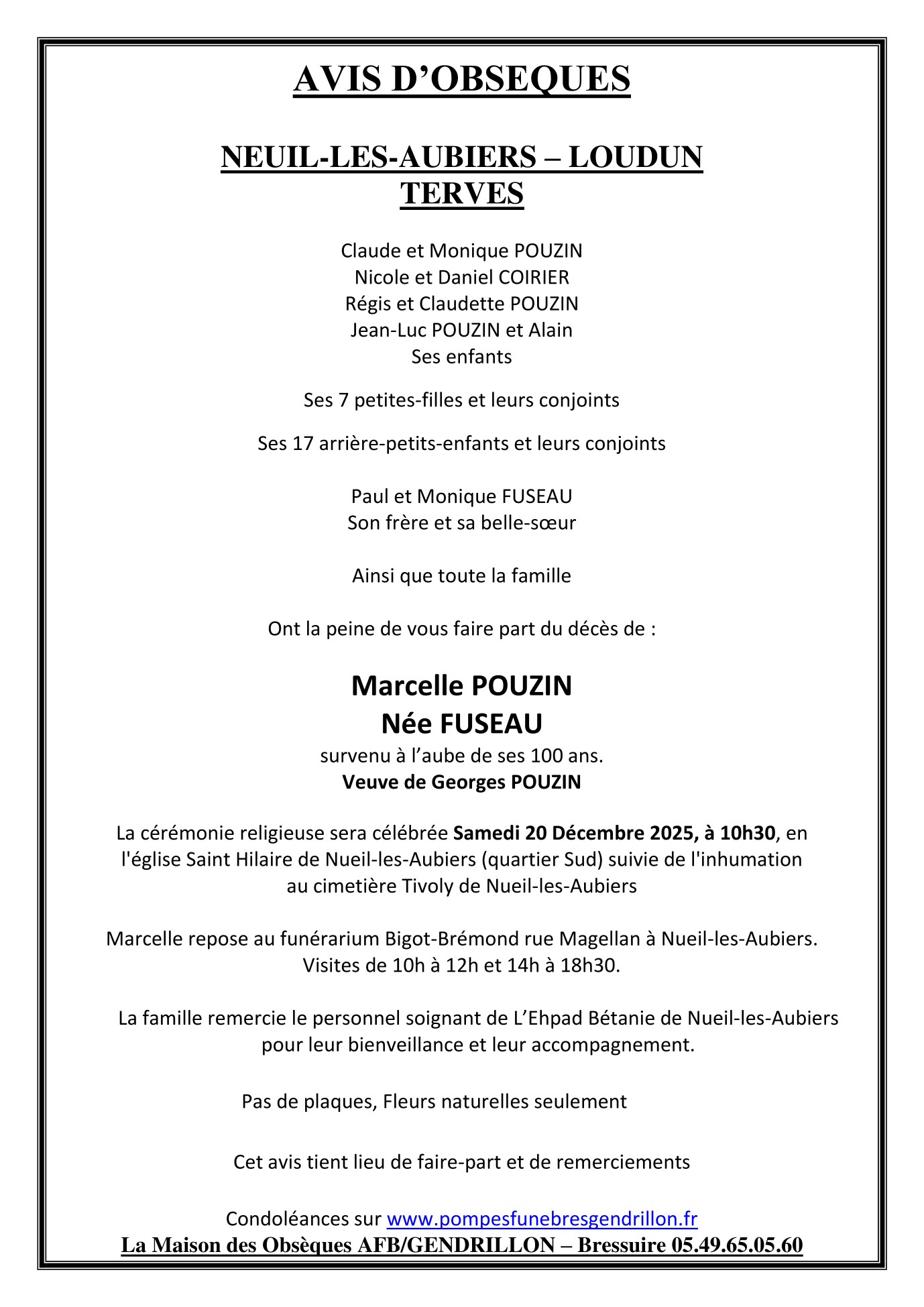 Décédée à Nueil-les-Aubiers (79250, France) le mardi 16 décembre 2025 à l'âge de 99 ans