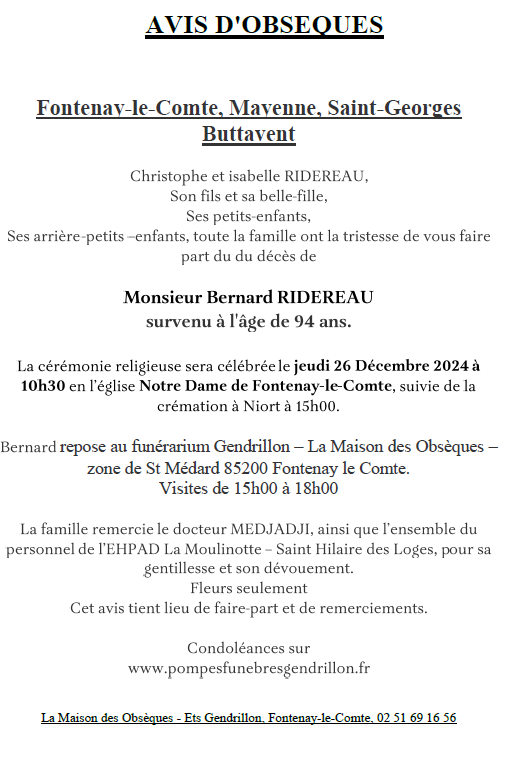 Décédé à Fontenay-le-Comte (85200, France) le jeudi 19 décembre 2024 à l'âge de 94 ans