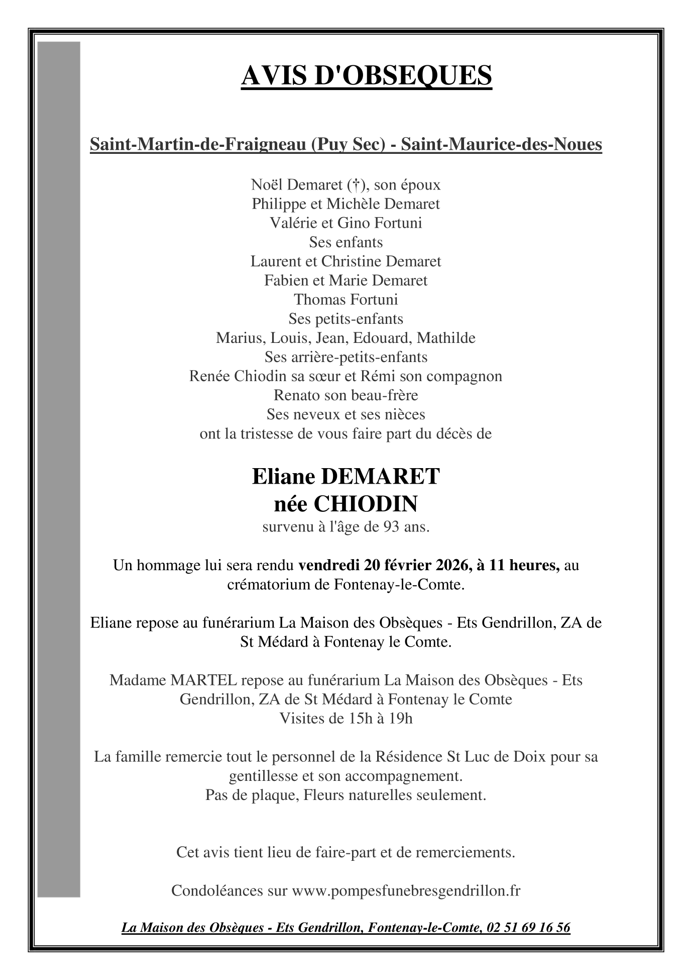 Décédée à  (85200, France) le samedi 14 février 2026 à l'âge de 93 ans