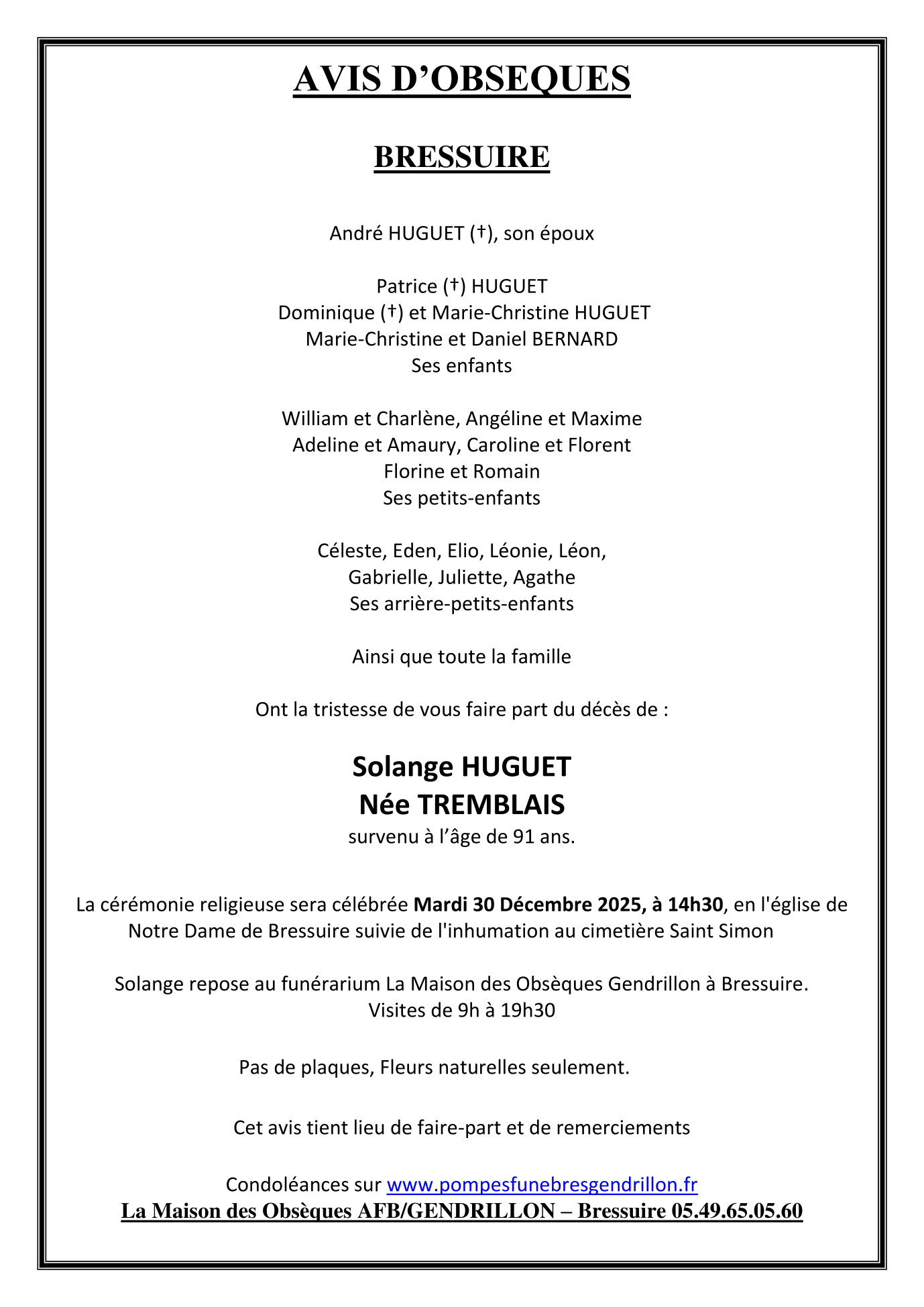 Veuve de Monsieur André HUGUET
