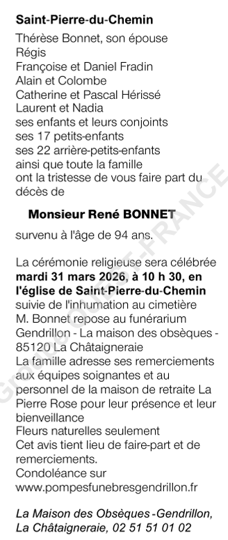 Décédé à Saint-Pierre-du-Chemin (85120, France) le vendredi 27 mars 2026 à l'âge de 94 ans