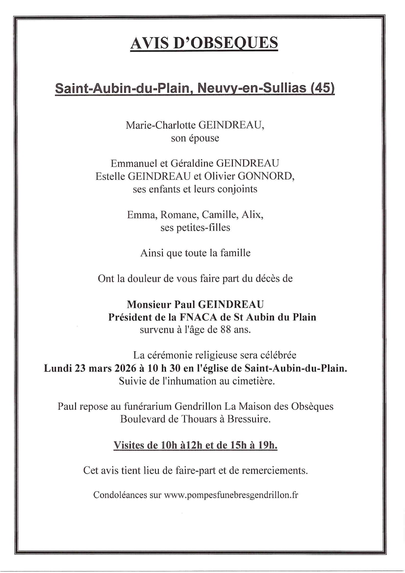 Né à Saint-Aubin-du-Plain (79300, France) le mercredi 9 mars 1938