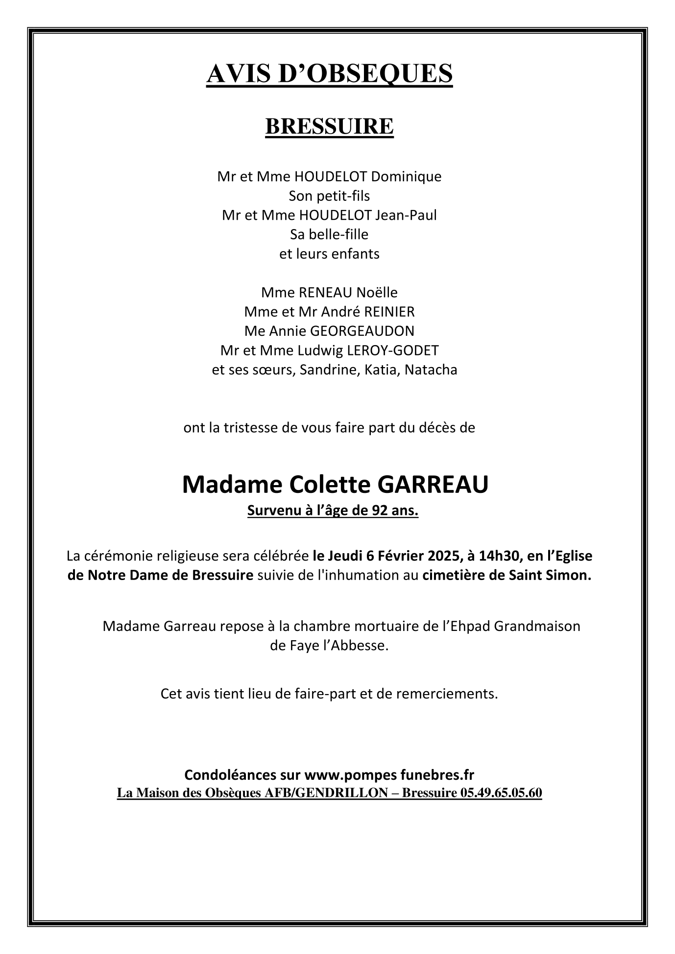Décédée à Faye-l'Abbesse (79350, France) le samedi 1 février 2025 à l'âge de 92 ans
