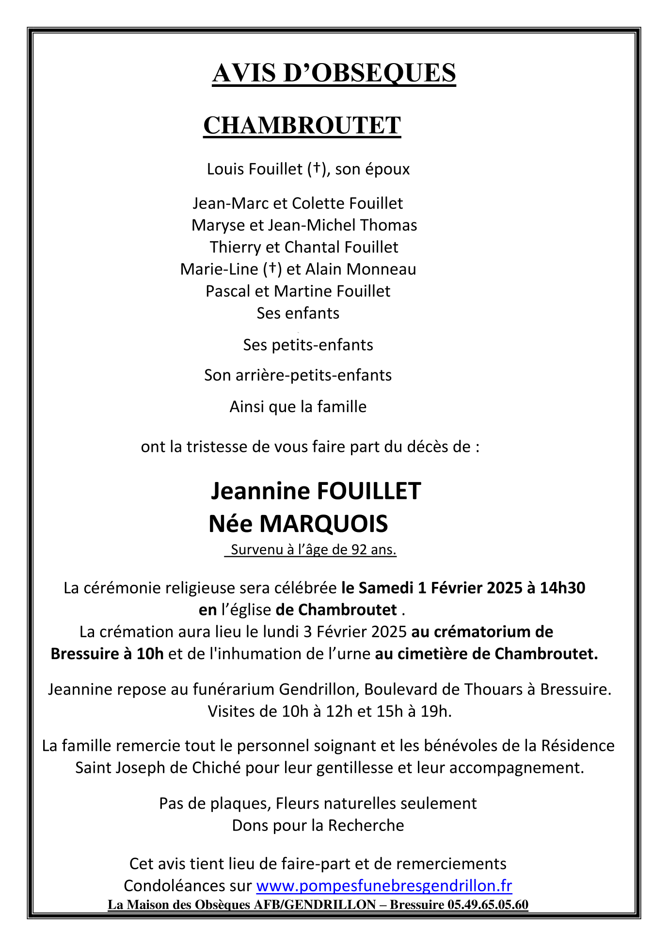 Madame Jeannine FOUILLET née MARQUOIS