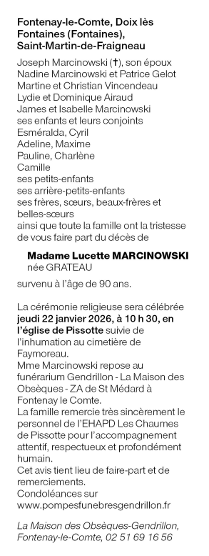Décédée à Pissotte (85200, France) le dimanche 18 janvier 2026 à l'âge de 90 ans