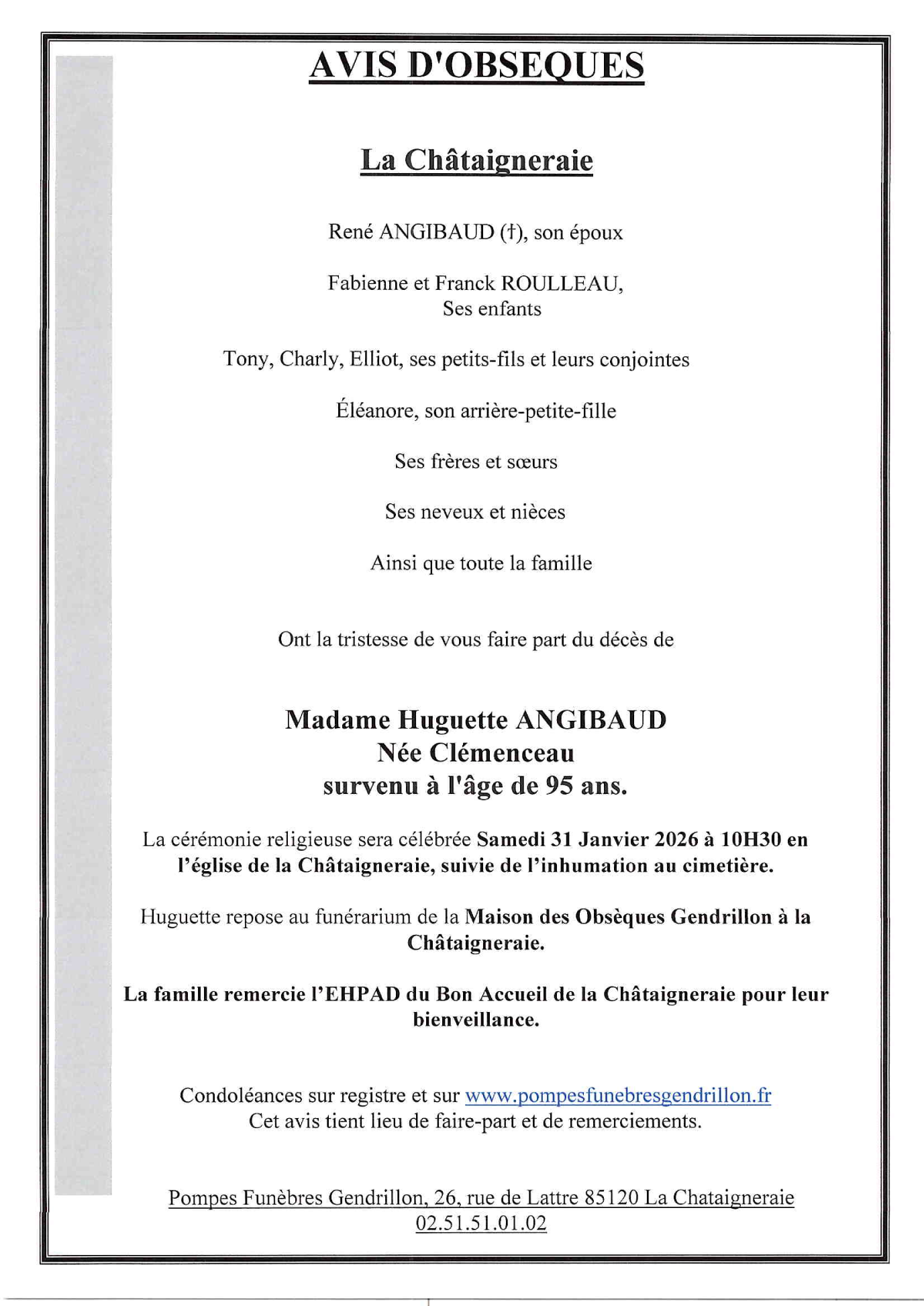 Décédée à La Châtaigneraie (85120, France) le lundi 26 janvier 2026 à l'âge de 95 ans