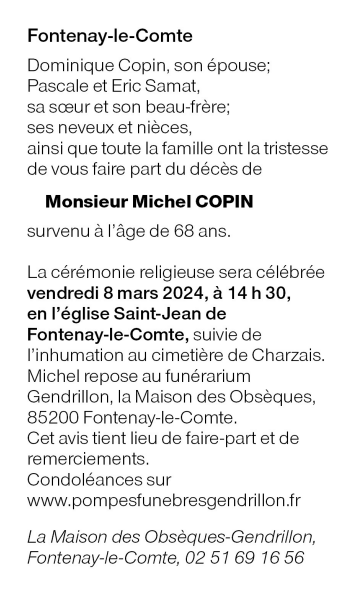 Décédé à Luçon (85400, France) le dimanche 3 mars 2024 à l'âge de 68 ans
