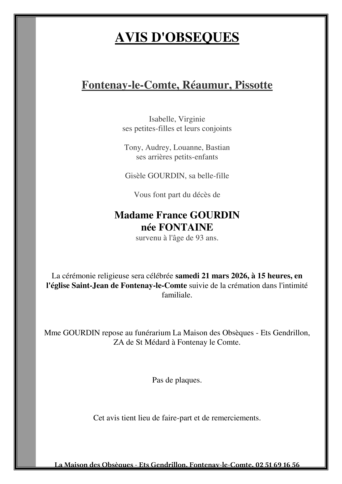 Veuve de Monsieur Roger, Jean, Jacques GOURDIN