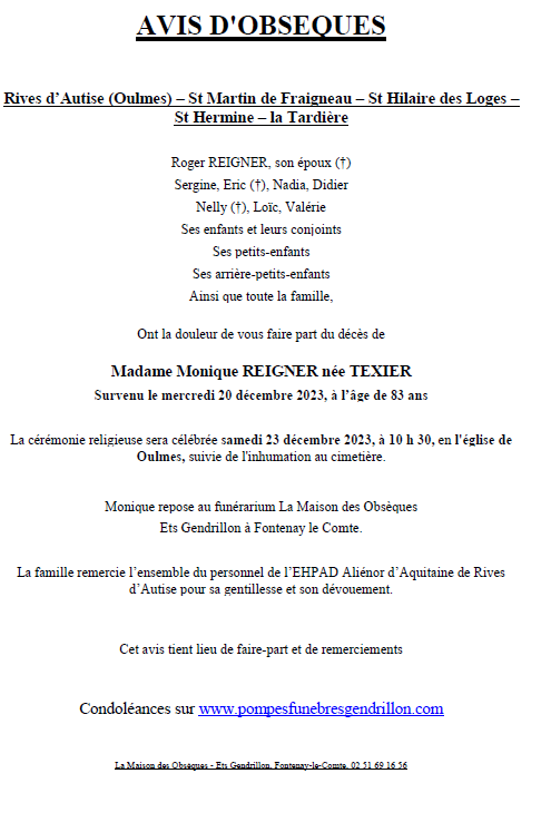 Décédée à Nieul sur l'Autise (85240, France) le mercredi 20 décembre 2023 à l'âge de 83 ans