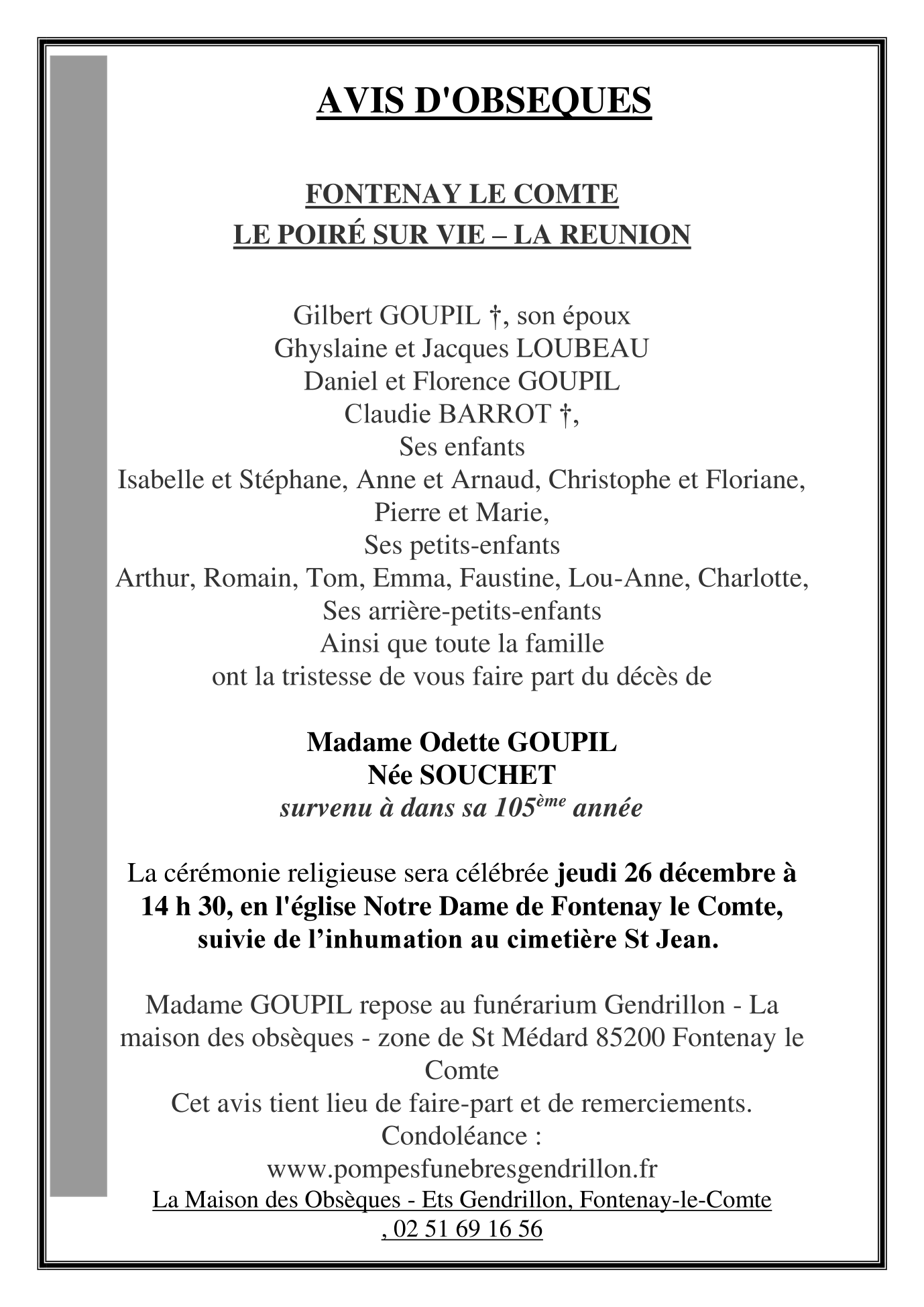 Décédée à Fontenay-le-Comte (85200, France) le lundi 23 décembre 2024 à l'âge de 104 ans