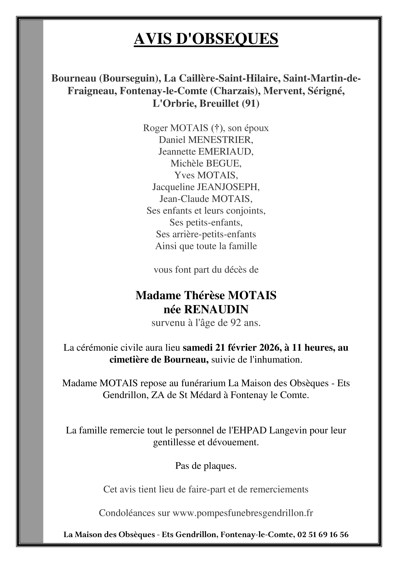 Décédée à Fontenay-le-Comte (85200, France) le mercredi 18 février 2026 à l'âge de 92 ans
