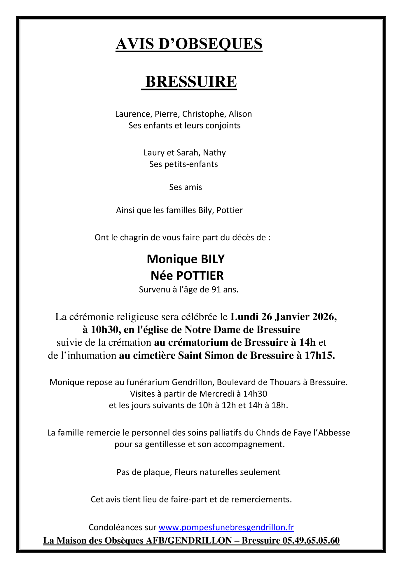 Décédée à Faye-l'Abbesse (79350, France) le lundi 19 janvier 2026 à l'âge de 91 ans