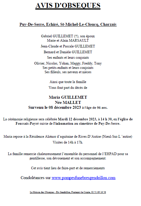 Décédée à Nieul sur l'Autise (85240, France) le vendredi 8 décembre 2023 à l'âge de 96 ans
