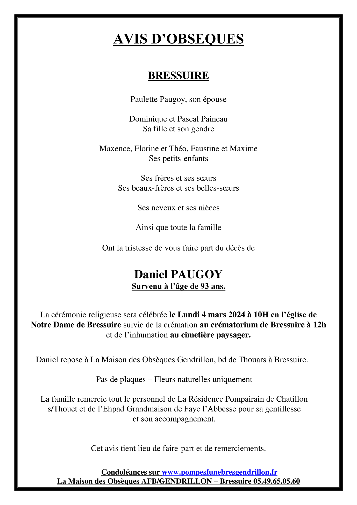 Décédé à Faye-l'Abbesse (79350, France) le vendredi 1 mars 2024 à l'âge de 93 ans