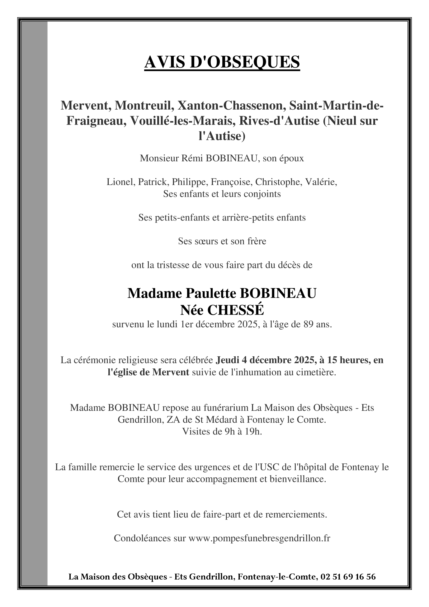 Décédée à Fontenay-le-Comte (85200, France) le lundi 1 décembre 2025 à l'âge de 89 ans