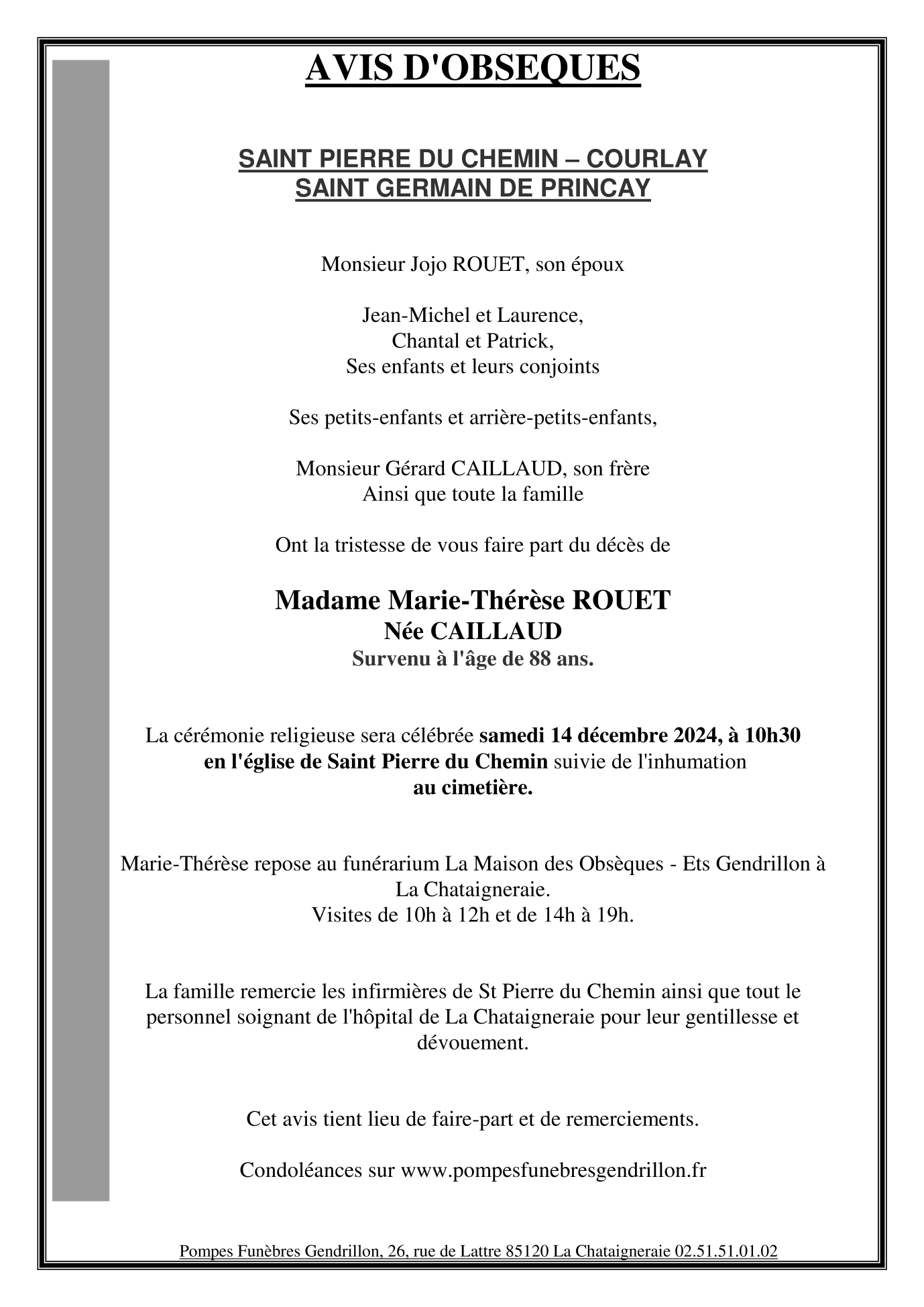 Décédée à La Châtaigneraie (85120, France) le mardi 10 décembre 2024 à l'âge de 88 ans