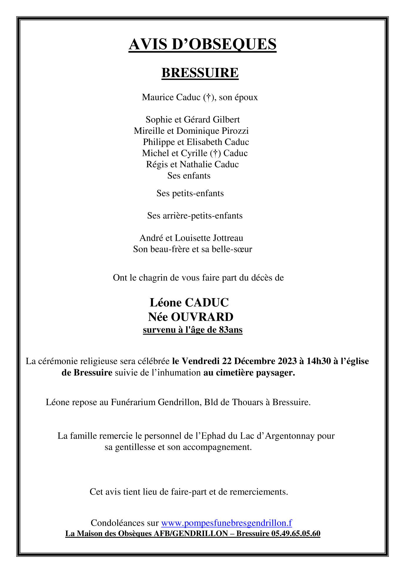 Décédée à Argentonnay (79150, France) le mardi 19 décembre 2023 à l'âge de 83 ans